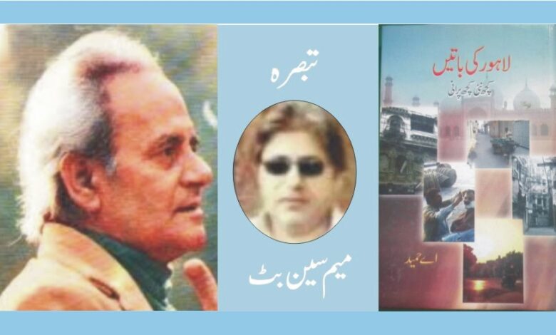 اے حمیدکتاب کے مضمون”میرالاہور“ میں شہر بے مثال کے حوالے سے لکھتے ہیں کہ”لاہور کا ایک اپناکلچر ہے، اپنی زبان ہے، اپنی رسمیں ہیں، اپنے میلے ٹھیلے ہیں، اپنی خوشیاں اور اپنے غم ہیں، اگرآپ کبھی لاہور آئیں اور اس کی سیرکرنا چاہیں تو یہ لاہورآپ مال روڈ، میکلوڈ روڈ، لارنس روڈ، ٹیمپل روڈ، بیڈن روڈ، زمزمہ توپ، چیئرنگ کراس چوک، میٹرو، ارجنٹینا ریسٹورنٹ اور کافی ہاؤس میں نہیں ملے گا اس سے ملنے کیلئے آپ کو میکلوڈ روڈ کا دریا عبورکرکے جھکے جھکے چھجوں والی تنگ وپیچدار گلی کوچوں، ٹیڑھے میڑھے بازاروں، برگد کی ٹھنڈی چھاؤں میں سوئے ہوئے مزاروں، تکیوں اورشاہی کبابوں کی دھواں کھائی ہوئی دکانوں پر جانا پڑے گا، مال روڈ اور میکلوڈ روڈ کے لاہور میں آپ کو ہر آدمی وقت کے تعاقب میں بھاگتا، دوڑتا ہوا ملے گا لیکن موچی گیٹ، انارکلی اورگوالمنڈی کے لاہور میں آپ وقت کو سگریٹ منہ میں دبائے، میز پر ٹانگیں رکھے بڑے آرام سے کرسی پر نیم دراز پائیں گے، پرانا لاہورنئے لاہور سے بڑا مختلف ہے، نیا لاہور اگر ٹکسال سے نکلا ہوا نیا سکہ ہے تو پرانا لاہورکسی مغل شہنشاہ کے تاج سے گرا ہوا عقیق ہے، آموں کے جھنڈ میں چھپی ہوئی وہ بارہ دری ہے جس کے سفید پتھروں پر سیاحوں نے عشقیہ اشعارلکھے ہوں۔۔۔!“